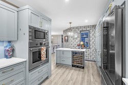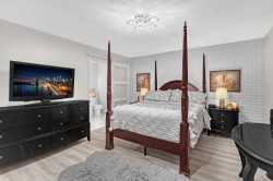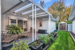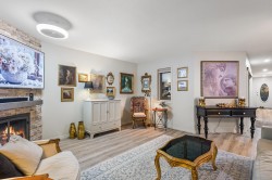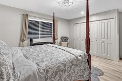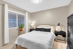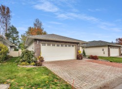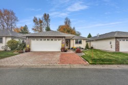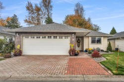 Stylish 2-Bedroom Rancher in 45+ Clover Creek! Discover this beautifully updated 1,585 sq ft detached home with 2 bedrooms and 2 bathrooms. Enjoy updated flooring, paint, lighting, and modern upgrades including A/C, updated hot water tank, roof and gutters with leaf guards. The kitchen impresses with extended cupboards for tons of extra pantry space, quartz countertops, an island, s/s appliances and a wine fridge. The spacious master suite offers double sinks, a large shower, and a sleek barn door. Relax by the stone floor-to-ceiling fireplace or step out through patio doors to a covered patio. Stone driveway with parking for 2 cars plus double garage and with a fully fenced yard this move-in-ready home blends comfort and style in a sought-after community!