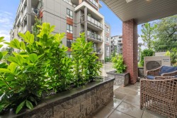 Welcome to the York in Garrison! This spacious, one-year-old, 717 sqft, ground floor 2-bedroom, 1-bath corner unit condo offers modern living in a prime location. As a former show home, it features designer finishes, upgraded fixtures, and a bright, open layout. Enjoy a sleek kitchen with stainless steel appliances, generous bedrooms, in-suite laundry, and easy ground-floor access. Step outside to your own private patio! Located close to shopping, dining, transit, and parks—this move-in-ready home blends comfort, style, and convenience. Comes with 2 parking stalls & 1 storage locker.