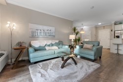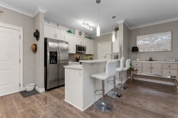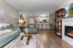 Rare opportunity at The Boulevard! This immaculate 1,100+ sq. ft. 2 bed 2 bath south-facing unit is perfect for entertaining. Highlighted by 9' ceilings, crown mouldings, quartz counters, and an electric fireplace. Stay comfortable year-round with integrated air conditioning. The primary bedroom includes a spacious ensuite with double sinks and a walk-in shower. A second full bath offers a tub/shower combo. Functional additions include a separate in suite laundry/pantry/storage room, four stainless steel appliances, and updated lighting and fixtures throughout. This pet-friendly building has no age restrictions, allows rentals, and is well managed by a proactive strata. Book a showing Today. OPEN HOUSE SATURDAY JAN.31/26 FROM 1 TO 3