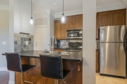 Stunning views. Upscale home with bright, wide open floor plan, 9 foot ceilings, floor to ceiling triple panel sliding door opening to private deck, fireplace, in a fantastic location. Great indoor/outdoor space. Serene while still being close to everything you need or want. The building is very solid. The den can be used as a second bedroom. Full stainless steel kitchen has a tile backsplash, great room has real hardwood floors, and the den has a glass front that keeps it private and bright. There is real pride of ownership throughout this building that is clean, neat and well maintained. The strata fee is very reasonable and it has a large contingency fund. 2 PARKING STALLS in secure underground parking lot. It even has a storage locker. MOTIVATED SELLER.