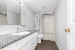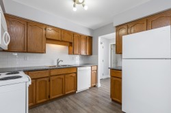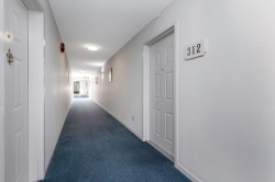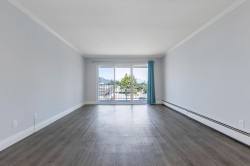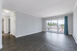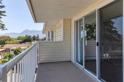 WOW! Elmwood Terrace penthouse unit! Spotless, inside unit with 2 bdrms, 1 bthrm, 992 sq ft of comfortable living space. Skylight at foyer, living room with sliding door to a large, covered sundeck facing North to panoramic mountain views. Fresh paint on walls, updated lighting. Kitchen with ample cabinets & newer countertops, backsplash, open to eating area. A separate laundry & pantry room. Good sized primary bdrm with large closet. Updated durable vinyl plank floors throughout. It's a friendly 55+ community with amenities such as rec center, workshop & exercise room. Strata fee includes heating in your home. Comes with storage locker on same floor as unit & 1 undrgrnd parking, additional parking for guests. Central location, close to Hospital. Have your realtor book a showing today!