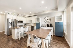 Stylish 2-Storey + Basement Townhome with double garage, fenced yard and plenty of storage. Step into a contemporary open-concept main floor with a stunning kitchen showcasing quartz countertops, gas range, and timeless white shaker cabinets. The bright dining area leads out to a private patio. This beautifully designed 3 bed 4 bath home, is 2,486 sq ft and offers modern comforts like central A/C, gas fireplace, and natural gas BBQ hook up. The finished basement offers a large rec room, media room, full bathroom, storage, bright windows and access to the fully fenced yard. This home is ideal for families or investors. Pet-friendly & Rentals allowed. FANTASTIC Sardis location