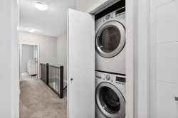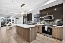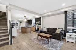 Welcome to this well cared for, 8 year old corner unit in Midtown with all the upgrades done. Stone countertops throughout, HW on demand, AC, privacy blinds, 12' vaulted ceiling in the master bedroom, double vanity in the Master bath, massive kitchen island, lots of cupboards, open concept living on main floor with 9' ceilings, large rec room & bathroom below, central vac and brand new high end Bosch dishwasher. Best location in the complex! Flex room below could be a 4th bedroom! Outside there is a fenced yard and a large beautiful 8x18 deck off the main with built-in pergola and privacy screens. This unit has the largest driveway in the complex big enough for large trucks and vans, as well as a large side by side garage. Tons of storage space in double wide garage.