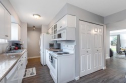 Bright and spacious 3 bed + den townhome in a great location! Updated kitchen with plenty of counter space, a breakfast nook and separate dining area. Recently renovated bathroom features new vanity and vinyl tile. More upgrades include a brand-new washer/dryer, high-efficiency furnace and heat pump with A/C! Well run complex with low strata fees that has kept on top of maintenance with updated cladding, windows, and roof. Complex includes community clubhouse and basketball court. Strata allows 2 cats, no dogs. Outside, find a private concrete patio backing green space. Located ideally right across from Townsend Park and the Chilliwack Coliseum, and only 5 minutes to District 1881 and hwy access. Great value here, come check it out today!