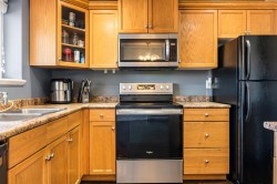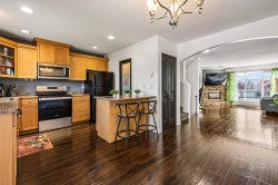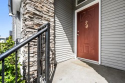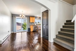 Welcome to Eden Park! Family & pet friendly, Unit #74 is open, bright, airy & spacious. Perfectly located in the complex with mountain views, featuring 3 beds up, 2.5 baths, rec room below which could also be a 4th bedrm, a yard, and balcony. The garage can fit a larger vehicle, and one more parking in the driveway. Beautiful laminate flooring, some new crisp paint, newer stainless steel stove & microwave, an eat-up bar, pantry, and the hot water tank is 2 years young - this home has been lovingly cared for. Enjoy the convenience of a gas bbq connection on the patio for all your bbq needs. The Primary Bedrm has a walk-in closet & 3 piece ensuite. A great, move-in ready townhome is waiting for you! Make this place your next home!
