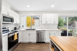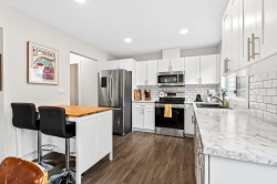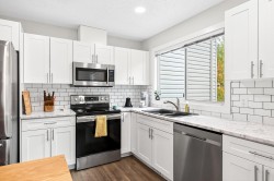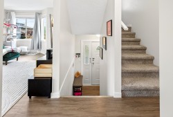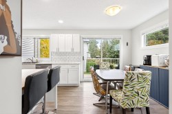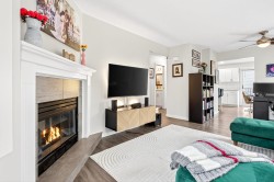 **Parkview Place** Spacious, Bright and updated END UNIT! Extensively renovated in 2021 including all white kitchen with S/S appliances, laminate flooring, baths, sinks, window blinds, pot lights & cozy gas fireplace. New (2024) hot water tank, two stage furnace + HEAT PUMP. Main level features living room with gas fireplace, dining room, updated kitchen + an eating area with access to the balcony. Upstairs has 3 spacious bedrooms including a primary suite with walk-in-closet + 2pc ensuite. Basement rec room + access to patio. Nice open yard, GARAGE and PET FRIENDLY! Close to bus, all levels of schools, shopping, Garrison Crossing, Vedder Crossing, parks and recreation including CULTUS LAKE!