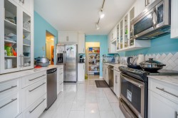 Bright. Beautifully renovated. Perfectly located. Welcome to Brookmere Tower, where comfort meets style. This bright and beautifully updated 2-bedroom, 2-bath home offers a spacious and functional layout with a stunning west-facing view, the perfect spot to enjoy breathtaking sunsets. The kitchen has been fully renovated with modern finishes, brand-new appliances, an added bar fridge, and a separate pantry for extra storage. The open-concept living area features a cozy gas fireplace and air conditioning, complemented by two generous balconies for seamless indoor-outdoor living. Residents enjoy top-notch amenities including an indoor pool, sauna, and fitness room. Ideally located just steps from the SkyTrain, Lougheed Mall, Coquitlam College, restaurants, the Vancouver Golf Course.