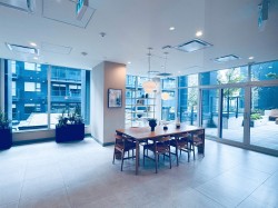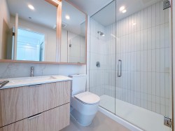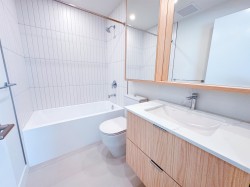 Welcome to JINJU by Anthem, a wellness-inspired 42-storey tower in West Coquitlam, steps from Burquitlam SkyTrain, Cottonwood Park, and the new YMCA. This bright Northeast corner 2 bed 2 bath home offers expansive windows, 9 ft ceilings, and a 131 sq.ft balcony with mountain views and morning sun. The open layout features durable laminate flooring throughout, spacious bedrooms, and year-round comfort with a heat pump system. The stylish L-shaped kitchen boasts integrated Bosch appliances, a 5-burner gas cooktop, quartz countertops and backsplash, plus a LeMans corner cabinet organizer. Residents enjoy 25,000+ sq.ft of amenities including a wellness spa, yoga studio, lounge, and outdoor hot tub with stunning views. A perfect balance of wellness, convenience, and modern living.