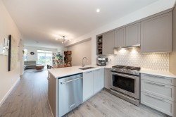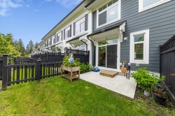 Welcome to this beautifully maintained, nearly new 3-bed, 3-bath townhome in Burke Mountain, Coquitlam. With a functional layout, large private backyard facing greenbelt and mountain views, this home offers an oversized gourmet kitchen with large island and KitchenAid stainless appliances, spacious living/dining area, and upstairs laundry. The primary suite includes a vaulted ceiling, walk-in closet and double-sink ensuite. Upgrades include laminate flooring throughout and a finished garage with polyaspartic flooring. Located in a family-friendly community with easy access to parks, shops and schools. Catchment schools typically serving Burke Mountain include Smiling Creek, Leigh and Coast Salish Elementary, Minnekhada Middle and Terry Fox Secondary