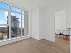 Exceptional 17th-Floor 1-Bedroom at “WEST” by Beedie. Enjoy 180-degree beautiful mountain, city, and ocean views from inside this brand-new concrete condo. Thoughtful design meets modern luxury with 9’ ceilings, custom millwork and an efficient floor plan that includes a generous bedroom plus versatile laundry/flex room. Chef-inspired kitchen showcases integrated Fisher & Paykel appliances — including gas cooktop — while air conditioning with smart thermostat keeps you comfortable year-round. Enjoy best-in-class amenities: state-of-the-art fitness centre, co-working lounge, oversized outdoor terrace, sports court and private guest suite. Outstanding location in Austin Heights connected to new Safeway and steps to cafés, shops and transit. 1 parking and 1 locker. This is it!