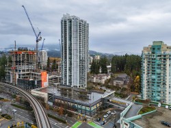 Welcome to Obelisk! This stunning 971 sq.ft. southwest-facing corner unit showcases sweeping, unobstructed views of SFU Mountain and Coquitlam Centre. Peaceful exposure, well away from SkyTrain noise and nearby development. Bright, airy layout with 2 bedrooms, a versatile den (easily turned into 3rd bedroom) & 2 full bathrooms. Features an open living/dining area, electric fireplace, updated 12mm laminate flooring, and fresh paint. Exceptional walkable location near SkyTrain, Coquitlam Centre, Henderson Mall, Library, West Coast Express, Douglas College, Pinetree Secondary, Glen Elementary, Lafarge Lake, and the Aquatic Centre. Amenities include gym, dry sauna, party lounge, bike storage, EV charging, and guest parking. Open house 12-1:30pm Dec 21