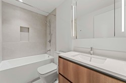 Brand new SOUTH-facing 2 BDRM corner home at Smith & Farrow by Boffo. Enjoy abundant natural light and a spacious 233 sqft patio with gas hookup. Features include A/C with smart thermostat, choice of designer dining table or 6' quartz island, integrated Fisher & Paykel/Bosch appliances, 5-burner gas cooktop, French door fridge, and custom pantry wall. Primary BDRM offers built-in wardrobe, heated ensuite floors, frameless glass shower, and medicine cabinets. Second bath with soaker tub, full-size laundry. Resort-style amenities: rooftop lounge, pool, hot tub, steam rooms & gym. 1parking + storage. Move-in ready! OPEN HOUSE Nov 1 2-4PM