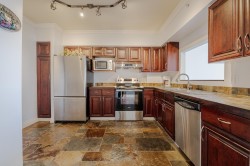 The Frontenac! This 3 bed/ 2bath 1450 sq ft top floor, corner unit is ideally located 1 block from the skytrain station, Coquitlam Center & all amenities. The main living space is bright & spacious featuring, several lg windows with California style shutters & a balcony, with views of the city & mountains. The beautiful brick fireplace & crown mouldings throughout the unit add a finished touch. The lg kitchen has S/S appliances, ample counter space & cabinets for all your cooking & entertainment needs. The Primary bedrm has a second balcony providing additional outdoor living space to enjoy quiet mornings or relaxing summer days. The ensuite features a spa like shower for extra comfort. The numerous closets, built-ins in the bedroom & insuite laundry adds to the convenience of this unit.