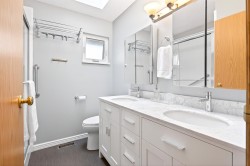 Come home to your peaceful oasis in a quiet cul-de-sac, once you are here you never want to leave. Perfectly situated on a private greenbelt with a sunny south-facing backyard. This beautifully renovated 4 level split home features solid hardwood floors, a newer kitchen with quartz countertops, high-end appliances, Atlas custom cabinetry, & a convenient butler bar. Enjoy a massive, covered sundeck and patio with a 50-year guarantee—ideal for BBQs and entertaining. Extended side yard offers space for a pool or? Renovated main bath includes dual sinks, skylight, and custom storage cabinets. Den off the entry, custom windows with built-in screens, LED décor switches and dimmers. Unfinished bsmt is roughed in for bath & f/p. Two mature apple trees complete this move in ready oasis. Act Now!