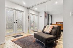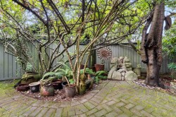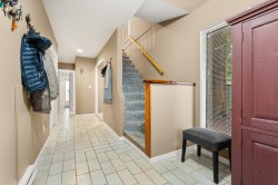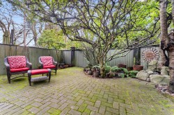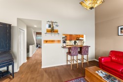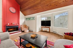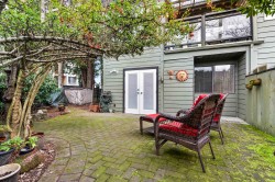 FAIRWAY VIEWS WYND! Private garden-view end-unit townhome offering 3 bedrooms and an exceptional sense of space and seclusion. The primary bedroom opens to a serene, treed patio, while a large fenced side yard provides rare outdoor flexibility for kids, pets, and entertaining. French doors and silver maple hardwood flooring add warmth and flow throughout. The well-appointed kitchen features extensive cabinetry and built-in storage - designed for real everyday living. Spa-inspired ensuite with soaker tub, rain shower, and radiant in-floor heat. The expansive living room is anchored by a wood-burning fireplace, creating an inviting gathering space. Generous upper bedroom adds versatility for guests, home office, or hobby area. Outstanding location just one block to the town centre.