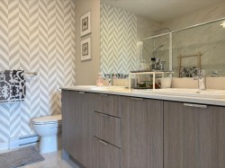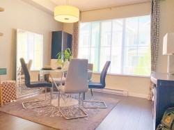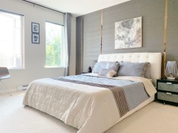 Welcome to this rare and spacious 2-bedroom townhome with the space and flexibility of a 3-bedroom layout—nearly 1,400 sq.ft. of thoughtfully designed living! Entertain with ease in the open-concept main floor, featuring a stunning island kitchen with Caesarstone counters, stainless steel appliances, double sinks, and sleek cabinetry. The sunken living room, with soaring ceilings, opens to a large sundeck overlooking the lush golf course. Upstairs, the king-sized primary suite shines with a walk-in shower, double sinks, and stone countertops. The oversized second bedroom can easily become a third room if needed. Recently upgraded with $18,000 in stylish touches, including entry tiles, laminate stairs, and designer wallpaper. Move-in ready and meticulously maintained—your dream home awaits!