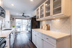 Stunning and move-in ready! This 1800 sq. ft. updated townhome offers bright, functional living with an open-concept main level, cozy gas fireplace & 200 sq. ft. of outdoor space. The kitchen boasts white shaker cabinets, granite counters, tile backsplash, vinyl plank floor & so much storage. Bathrooms feature new sinks, counters & flooring. Includes 2 large bedrooms plus den (possible 3rd bed). The spacious primary has a renovated 3-pc ensuite, electric fireplace & private balcony. Two parking stalls, including an enclosed single garage, plus abundant storage throughout. Ideally located near transit, schools, parks, shops, restaurants and amenities.