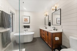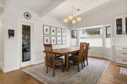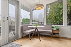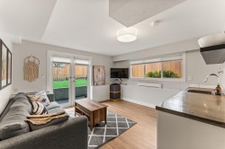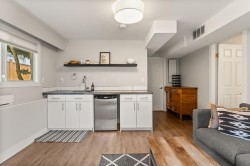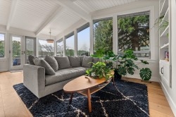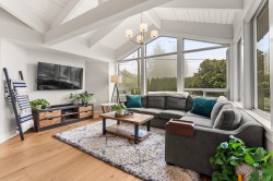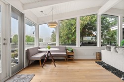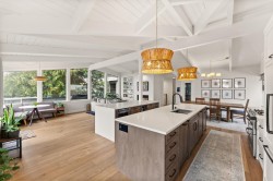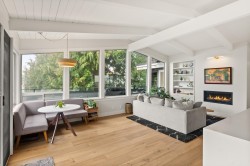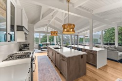 Elegantly renovated West Coast contemporary residence showcasing dramatic post-and-beam ceilings in the expansive great room. The beautifully redesigned kitchen features custom cabinetry, quartz countertops, professional-series appliances, and dual islands ideal for everyday living and entertaining. Floor-to-ceiling windows frame picturesque views and open to a sun-filled southwest-facing deck. The upper level offers new hardwood flooring and a serene primary retreat with a luxurious five-piece ensuite, walk-in glass shower, and freestanding soaker tub. Ideally located in the Village on prestigious Pacific Drive, this exceptional home includes an additional bedroom with in-law or nanny potential, a private office, media room, and an oversized double garage with workshop and ample storage.