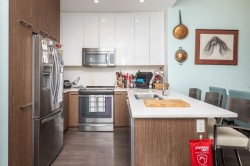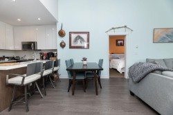 Beautifully appointed 2-bedroom condo offers a modern design with soaring vaulted ceilings that create a bright, airy feel throughout. Located on the top floor of a well-maintained building, the open-concept layout features adjoining living, kitchen and dining area, contemporary finishes, and plenty of natural light. Enjoy the convenience of a central location—just steps to shops, restaurants, recreation, and all amenities. Additional features include a 54 sqft balcony, storage locker, secure underground parking, and easy access to public transit at your front door. Perfect offering for those seeking a stylish home in the heart of it all!