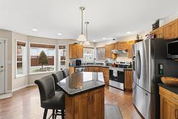 Welcome to this well-maintained and thoughtfully updated 3-level home in the desirable Aberdeen neighbourhood of Kamloops. Offering 5 bedrooms and 4 bathrooms, this home features a functional layout ideal for families or those seeking suite potential. The upper level includes the primary bedroom with a walk in closet and jetted jacuzzi tub, two additional bedrooms, and a main bathroom. The main floor offers a spacious living and dining room ideal for entertaining, with a gas fireplace in the living room, a second gas fireplace in the family room, a laundry room and a convenient 2 pc powder room. The lower level includes two more bedrooms, a full bathroom, and a separate entrance, making it suite-ready (no stove) and perfect for extended family or mortgage helper options. Recent upgrades include air conditioning (2023), hot water tank (2023), washer and dryer (2023), and upgraded stove and dishwasher (2025). Additional features include underground sprinklers, central vacuum, side gate with direct access to basement stairs, and excellent parking. A recently added front parking pad allows space for up to five vehicles. Infrastructure updates include a professionally repaired water main in 2021 with new water main piping installed in the basement bedroom closet. Close to schools, shopping, parks, and all Aberdeen amenities.