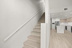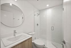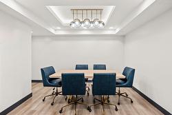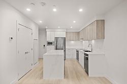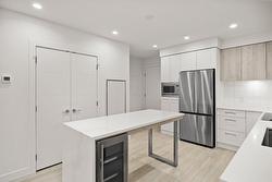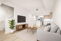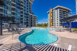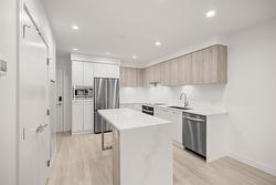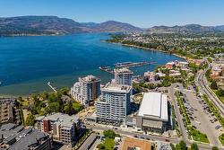 Welcome to Aqua Waterfront Village, Kelowna’s premier lakefront community in Lower Mission. This 2-storey, 2 bed, 2 bath townhome offers approx. 1,015 sqft of interior living, 155 sqft of exterior space, and includes a private, tandem 2-car garage in the building's parkade. The main floor features a bright, open-concept layout with oversized windows providing ample natural light. Luxury wide-plank vinyl flooring extends throughout the kitchen, living, dining, and bedroom areas. The kitchen showcases modern two-toned cabinetry, polished quartz countertops, dining island, integrated LED lighting, and a premium stainless steel appliance package that includes a wine fridge. Upstairs, you’ll find 2 generous bedrooms and 2 contemporary bathrooms featuring quartz vanities, porcelain tile and stylish finishes. Additional touches include blackout roller shades in the