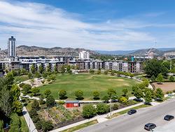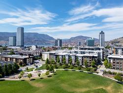 Bright & modern 1 bed condo with large, ground level patio at Central Green! Welcome to your peaceful urban retreat in the heart of Kelowna. This stylish one bedroom, one bathroom condo is tucked away on the quiet courtyard side of the sought-after, LEED-certified Central Green 2 development, a pet-friendly community directly beside Rowcliffe Park. Rarely offered, this unit features an extra-large patio, perfect for outdoor relaxation, entertaining and pets. Inside, enjoy the airy feel of higher ceilings and an open-concept layout. The kitchen is outfitted with sleek quartz countertops and stainless steel appliances, offering a clean, modern aesthetic. The home comes with one secure underground parking stall and a private storage locker for added convenience. Located just steps from downtown via the new Bertram pedestrian overpass, you're within walking distance to restaurants, shops, groceries, beaches, and schools. Kelowna General Hospital is only a five-minute drive away. Rowcliffe Park features a community garden and a fully fenced dog park, making this area ideal for all everyone.