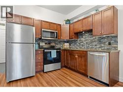 Top floor, quiet executive condo located in the desirable Pinnacle Pointe Golf Resort on the premier Okanagan golf course in Quail Ridge. Just minutes from Kelowna International Airport, UBCO, transit, shopping, and dining, this location offers exceptional convenience and lifestyle appeal. This is a prime investment opportunity with no rental restrictions, pet friendly and the popular amenity-rich building maintains strong occupancy for both short and long-term rentals. The stylish two-bedroom condo has been beautifully renovated and is truly move-in ready, featuring luxury vinyl plank and ceramic tile flooring throughout, granite countertops, solid wood shaker-style cabinetry, electric fireplace, and a brand-new deck. Extensive 2025 upgrades include a custom glass and stone backsplash, stainless steel Whirlpool refrigerator and over-the-range microwave, GE convection range, full-size Electrolux washer and dryer, modern LED lighting, spacious closet organizers with a walk-in pantry, new blinds, bi-fold doors, trim, faucets, and fresh paint throughout. In June 2025, a brand-new forced-air furnace and fan coil A/C unit, still under warranty was installed, providing year-round comfort and peace of mind. Strata fees include heat and cooling, and building amenities offer excellent value with a heated underground parking stall, bike storage, on-site security and building manager, fitness centre, and seasonal pool and hot tub, making this an affordable Okanagan lifestyle option. (id:27)