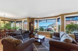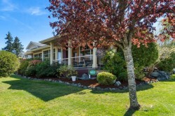 A picturesque rancher providing an ideal open living design, quality finishing, and tranquil ocean views to make you want to stay. Major highlights include a new heat pump, a 2023 detached 14x24 workshop/ garage, and a fiberglass shingle roof replaced in 2013. Featuring a designer kitchen, hardwood flooring, crown moldings, natural gas fireplace all with wheelchair accessibility. The kitchen is deluxe with cherry cabinetry & a central island with garden sink. The great room offers a comfortable space to entertain with a wall of windows to experience the mature landscape & views. The dining area can accommodate all your gatherings with the French door access to a private covered patio. Retreat to your own spa inspired ensuite with walk through rain shower to soaker tub. For car enthusiasts or those in need of a place for hobbies the double garage & detached workshop/ garage will create Zen. This is a quiet haven on a cul-de-sac near marinas, golfing, and close to Ladysmith’s shopping.