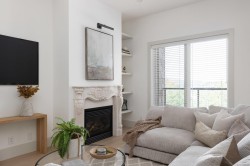 OPEN HOUSE SUNDAY January 25th 1-3pm!Beautifully updated top-floor residence in Ponds Landing, ideally located in the village at Bear Mountain Resort.This 2-bedroom plus den home blends modern elegance with timeless design, featuring curated finishes, designer lighting, and a soft neutral palette throughout.The airy 10-ft ceilings and open-concept layout frame a chef-inspired kitchen with a quartz waterfall island, custom wood cabinetry, farmhouse sink, and striking brass details.The inviting living room centers around a custom stone gas fireplace and opens to a covered patio with peaceful courtyard views.The primary suite offers patio access, walk-through closets, and a spa-like ensuite, while the second bedroom has a walk-in closet. The den presents a built-in desk for a flexible study or work from home space.Enjoy year-round climate control with an efficient heat pump. Complete with in-suite laundry, secure underground parking, and storage locker.