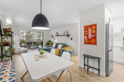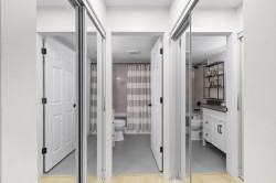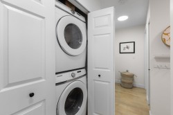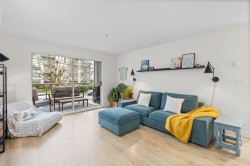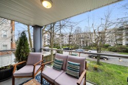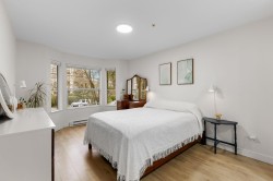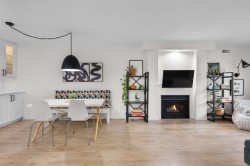 Step inside and fall in love. This bright 2 bed, 2 bath corner suite has been thoughtfully upgraded. The kitchen shines with expansive quartz counters, a custom coffee bar with floating shelves and bar fridge, sleek white shaker cabinets with soft close doors and under mount lighting, plus stainless appliances including a 4 door fridge. Oak laminate flooring and custom lighting carries through the home for a warm, elevated feel. The open living and dining space is perfect for relaxing by the gas fireplace or stepping onto your sunny south facing balcony. Enjoy views of mature trees from every room. Both bathrooms feature quartz counters and deep soaker tubs. Full size laundry adds convenience. Bonus extra street parking for your second car and a short distance to the future SkyTrain.