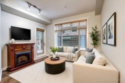 WALNUT RIDGE 3 / QUADRA HOMES. ICONIC condo features; 2 bed + 1 bath, Huge extra in-suite storage, Heat pump/AC, Concrete + wood combined HYBRID building, Laminate flooring throughout, BBQ Gas hookup & stove, Gas is included, 2 PARKING, Rolling huge storage, heated floor in bathroom, NEW FRESHLY PAINTED throughout, Updated appliances. Very PRIVATE location, Acoustic sound dampening in the floors. PRIVATE East facing patio w/ SEPARATE ENTRANCE - BEST for kids & pets, Located on the ground floor with easy access to nearby shops and amenities. Yorkson Middle Schools - 4 mins walking & Elementary - 8 mins walking & RE Mountain Secondary - 5 min driving. Perfect unit for a first home buyers or investors!