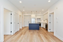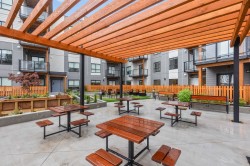 Fabulous home in the "Fauna" Bldg in Willoughby! Newer 2-bdrm + den home on the ground floor with direct entry access off patio. Wide-plank vinyl flooring thru home & bright color scheme applied amidst high 9' ceilings. Open-concept kitchen w/quartz & Samsung S/S appls. 2 full baths, 1 ensuite, comes w/top notch fixtures & finishing. Both bdrms well-laid out w/large walk-in closet in pbdrm. Den offers valid home-office option. Full-size front loading W/D + nice patio off lvgrm, perfect to lounge, BBQ or do a little gardening. 2 pets okay. 1 prkg w/EV option, 1 locker incl. + use of bike rm., gym, amenity area, large playground avail. Enjoy peace of mind with 2-5-10 warranty. Superb Willoughby location close to 200th St, Willowbrook Mall, schools, parks, restaurants.