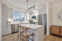 Bright, open, southwest-facing 2-bed, 2-bath corner home with a highly sought-after ground-level walkout patio, built by award-winning Zenterra. Excellent floor plan with 9 ft ceilings and vinyl plank flooring throughout. The kitchen features shaker-style cabinetry with a pantry, Samsung stainless-steel appliances with a gas range, a large island, quartz countertops, and an undermount sink. Two spacious bedrooms plus a bonus linen/storage area. Gas hookup on the patio. Unbeatable location: walk to coffee shops, restaurants, fitness facilities, and the Langley Events Centre. Future rapid transit will connect this area directly to SkyTrain. One underground parking, with more available to rent/purchase, plus plenty of street parking right out front.