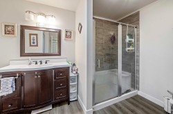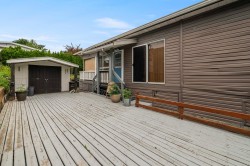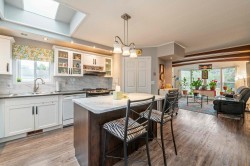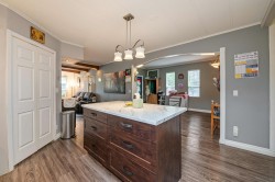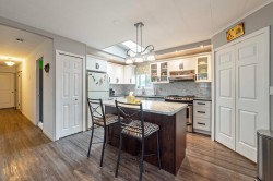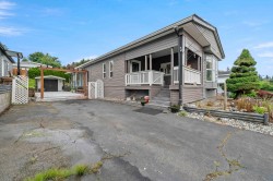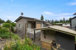 Perfect Pioneer 55+ Park. This mid-hilltop home offers a blend of modern updates & natural surroundings, making it a perfect retreat. Located across from a park, it features a new pitched roof added in 2021 and durable vinyl siding for minimal upkeep. The updated kitchen with a skylight invites abundant natural light, and laminate flooring adds a sleek touch throughout. The primary bedroom has an ensuite door to a spacious main bath. For gardening enthusiasts, the tiered gardens are inviting. Enjoy the outdoors on the cozy covered porch & a large open deck. Low-maintenance yard backs onto greenspace, offering privacy. With ample parking & allowance for 2 pets without size restrictions, this property is full of possibilities. Co-op Fee just $510/mnth.
