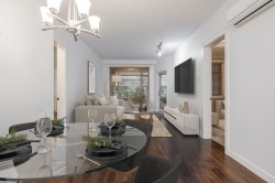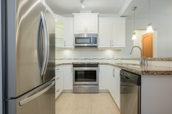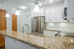 2 BED | 2 BATH | LARGE FLEX/DEN | PRIVATE PATIO. Bright & beautifully designed OPEN CONCEPT home that is functional, well laid out & exceptionally built. Bedrooms are positioned on opposite sides for added privacy, each with walk-through closets and ensuites featuring heated floors. Versatile DEN/FLEX room with closet works as a home office or potential 3rd bedroom. Updated white kitchen with quartz counters, 5-burner stove, walk-in pantry & BRAND NEW fridge with ice & water. Large private patio for year-round use. AIR CONDITIONING & high-efficiency heat pump. Updated carpets in both bedrooms. Vacant & move-in ready. 2 parking stalls plus secure garage-style storage with power. Excellent location close to shops, restaurants, schools, trails & HWY 1. Strata fee incl gas, hot water & gym.