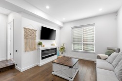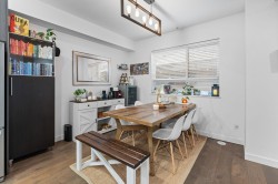 Welcome to this very clean and very well-kept 3 bed and 2.5 bath townhouse in The Terraces! The main floor offers an open-concept living room, a kitchen with a large island with a quartz countertop, and a dining area, which leads to a patio with turf. The upper floor has a decent-sized primary bedroom with its own ensuite and two additional bedrooms and a family bathroom. Additional features include central AC and hot water on demand. This centrally located complex is just a few minutes' walk to shopping, restaurants, recreation, parks, and the future new Skytrain station.Bonus EV charger, Updated Washer/Dryer, Hoodfan and hot water. Move in ready!