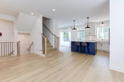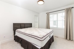 Welcome to HOMESTEAD—this 2021-built 3-storey townhome offers 1,792 SF of elegant living with 4 beds/4 baths, and a side-by-side double car garage. Corner unit! Enjoy luxury finishings including intricately designed feature walls with crown-style detailing, vaulted ceilings in the primary bedroom, and spa-inspired bathrooms. The open-concept main floor features KitchenAid S/S appliances and A/C for year-round comfort. Step out to a spacious, fully fenced backyard backing onto a tranquil greenbelt—perfect for privacy and entertaining. Bedroom with full bath on below level is ideal for guests or office. A rare blend of style, space, and serenity! Walking dist. to parks, trails, schools, transit, & mins to Hwy 1. Low strata fees and pet-friendly. Openhouse Sat Nov. 22, 2-4 pm