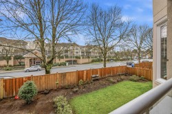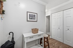 Prime location! This beautifully updated 1,087 sq ft, 2 bed, 2 bath home is just steps from everything Langley has to offer. Restaurants, Willowbrook Mall, transit, and the future SkyTrain are all within two blocks of your front door. A welcoming foyer opens into an inviting living area highlighted by a striking stone fireplace. Extensively renovated in 2020, the home features laminate flooring, designer paint colours, an updated kitchen, and elegant crown mouldings throughout. The generous primary bedroom boasts a feature wall, barn door to walk-through closet leading to ensuite. Relax and unwind on the south-facing covered patio, perfect for summer evenings. Complete with in-suite laundry, pet-friendly living, and two parking stalls, storage on the same floor. An exceptional opportunity!