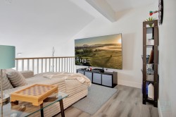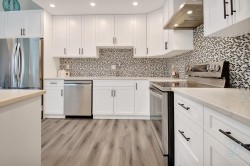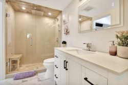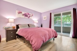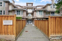 WESTSIDE ESTATES | A rare find—this stunning 2Storey TOP FLOOR CORNER UNIT is the largest in the building, offering 3BDRMS, 2BATHRMS, 2PARKING, 3DECKS + LOFT! South/West facing, filled w/ natural light, it features VAULTED ceilings & an OPEN CONCEPT layout that feels like a home w/out the upkeep. Beautifully updated throughout, enjoy a LRG bright kitchen w/ peninsula, quartz counters, SS appliances, dining & deck access perfect for BBQs. GRAND livingrm showcases 2 BAY windows, GAS fireplace & custom built-ins. MAIN FLR PBDRM includes a DRESSING rm w/ island drawers, PRIVATE deck, STEAM shower ensuite & laundry access. Upstairs offers a 2nd entrance, airy LOFT, & 2 spacious BDRMS; one w/ W.I.C, ENSUITE access & PRIVATE deck. Pets welcome! Steps to mall, amenities, schools & future Skytrain.