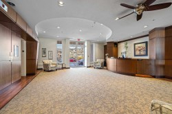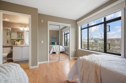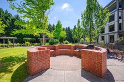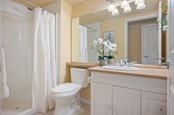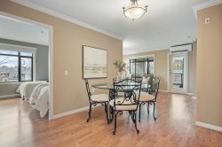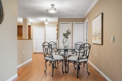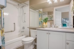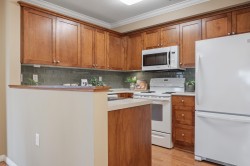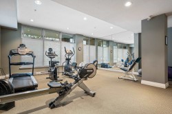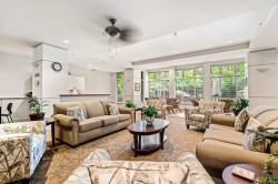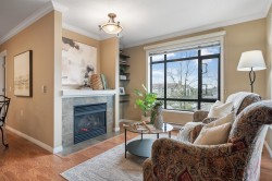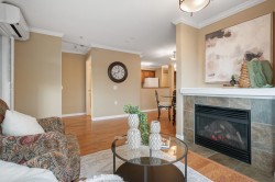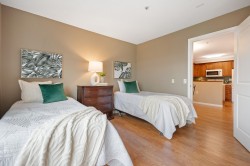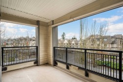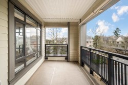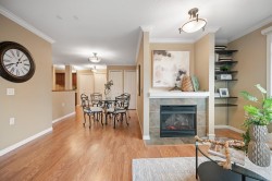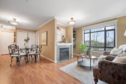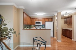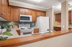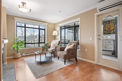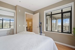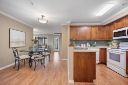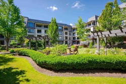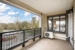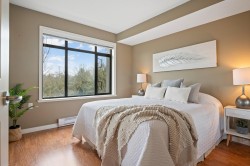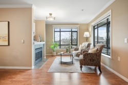 Sought after 55+ complex in Walnut Grove! Welcome to your new home at the Residences. Large 2 bedroom 918 sq feet, 2 full baths w/South West Exposure, corner unit with tons of windows. Original owner with unique floorplan, great separation of bedrooms, extra cabinetry in foyer, crown moldings, laminate flooring throughout and heated primary ensuite floor. For warm days there's Air conditioning(heat pump 2022). Right next to roof top patio. Great sense of community w/concierge service, media room w/ big screen tv, lounge w/ cozy fireplace, underground parking, garden & bbq common area & a great exercise room. Well managed strata, building re-piped! Centrally located, easy walk to shopping at Thunderbird Village, medical clinics & restaurants . An absolute perfect place to call home!