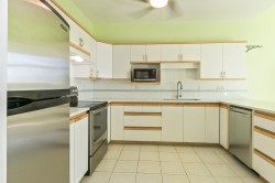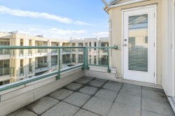Top Floor 1300SF Corner Unit at Cassola Court, with an eastern view of the inner courtyard. Features 2 beds, 2 baths, 9ft ceilings throughout & vaulted ceilings in the eating area & living room. Living room has a cozy gas fireplace w/ gas included in the strata fees. The ensuite has a walk-in tub. The kitchen has SS appliances. Upgrades include new quartz kitchen countertops, new undermount kitchen sink, a brand-new kitchen faucet and a newer HW tank. Amenities include a meeting room, library, exercise room & an outside inner court to sit & meet w/ friends. Storage locker & an underbuilding parking stall included. Additional parking spaces are available to rent at a minimal cost. This is a very well-run strata. Located within walking distance, to dining, shopping and a stroll in the park.