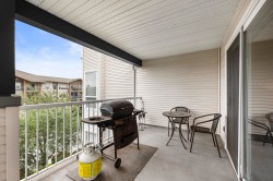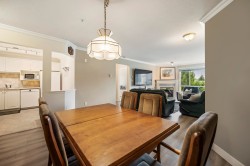 Welcome to Monterey Grande! This rarely available TOP FLOOR 2-bed, 2-bath condo offers 1,030 sq ft of spacious living in a QUIET location. You will be greeted with an open floor plan featuring UPDATED laminate flooring & crown moldings with a large dining area open to the living room featuring a cozy gas fireplace! The oversized primary bedroom boasts double closets w/ensuite + generous second bedroom, family bathroom & laundry room with SXS washer & dryer! Enjoy your morning coffee with mountain views on your large covered deck! BONUS storage locker conveniently located right beside your unit + 1 underground secure parking spot! The well-managed building features an amenity room, bike storage & workshop. Located - close to shopping, restaurants, an off-leash dog park & future Skytrain!