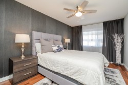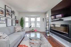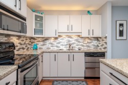 BETTER THAN NEW! This TOP FLOOR 2 beds/2 full bath unit offers 872sf of living space! As you enter you will feel the warmth of this home that has been tastefully updated. Starting with the kitchen that offers a good sized island, all new two toned cabinet doors/hardware, beautiful backsplash, granite counters, & S/S appliances. Main living is flooded w/natural light & features modern wall mounted fireplace + updated modern blinds. 2 good sized bedrooms (both w/new flooring) on opposite sides. Main bath beautifully updated w/new vanity, modern finishing/wallpaper & flooring. Ensuite updated w/ gorgeous new shower, counter, hardware, & flooring. In-suite laundry (updated washer/dryer) + storage room in unit. Great location close to schools, shopping, parks, amenities & future skytrain!