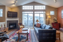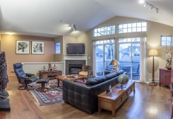 Gorgeous & bright! This airy upper-level unit features 2-beds, 2-baths, vaulted ceilings & big windows. The summer breeze is wonderful with no A/C needed. Beautiful engineered hardwood in all the living areas was expertly levelled when installed. Classic white kitchen with a large, south-facing window right over the sink. Wrap-around bar with updated granite countertops & tile flooring. Spacious bedrooms w/flowering trees right outside your windows. Two RENO'D bathrooms - just gorgeous! Two gas fireplaces & two balconies! Covered west-facing balcony overlooks the park & playground. Single garage with plenty of mezzanine-style storage. Longest driveway pad in the complex. Park your larger vehicle without worry...or even two small cars on the pad...plus the single garage too!