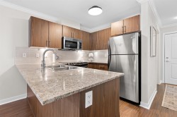 Welcome to The Grove in desirable Walnut Grove. This bright 722 sq ft 1 bed + den home features a spacious open layout with the living area set slightly apart from the dining space. The kitchen is finished with stainless steel appliances, granite counters, and a breakfast bar, plus a covered west facing balcony overlooking the quiet central courtyard, perfect for BBQs or unwinding after work. Includes 1 parking and 1 storage locker. Unbeatable location just off Hwy 1 with the walkbridge steps away to Fresh St Market, Shoppers, fitness studios, restaurants, shops, trails, and Carvolth Exchange. Close to Dorothy Peacock Elementary.