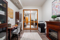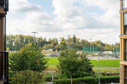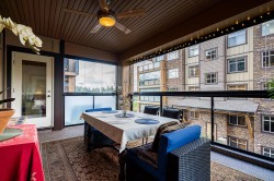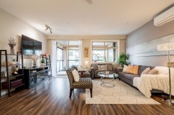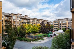 Yorkson Creek Walnut Ridge – highly sought after! Upsizing or downsizing is easy with this spacious 1,602 sq. ft. executive home (Style M2). Enjoy year-round comfort in the 202 sq. ft. solarium/enclosed balcony with retractable glass panels & gas BBQ hookup—perfect for extended living space. Two primary suites with ensuites on opposite ends for privacy. Den/flex area ideal for a home office. Kitchen offers ample cabinetry, S/S appliances incl gas range, & large breakfast bar. Features A/C + Heatpump, peek-a-boo park view, 2 parking (1 oversized) & xl secure locker. Great walkability—close to shops, parks, rec & Hwy access!