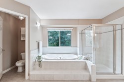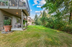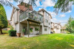 Welcome HOME! Looking for something special - you might just have found it here at the desirable gated Woodridge community. This home offers you the unique lifestyle of level entry living with TWO primary bedrooms if desired - total of 4 bedrooms. Upper level is a large suite w/2 W.I.Closets & 5 pc ensuite & main floor features a primary w/ ensuite (or use as a family room/den). High ceilings through-out the home including downstairs - where you have a rec.room-office & two further bedrooms. A duplex-styled home that is surrounded by greenery & overlooking Kanaka Creek for privacy & beautiful nature views. A double garage plus room for small vehicle to park out front. Lots of possibilities here!