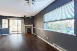 Set back from major roads and accessed by a quiet panhandle driveway, this spacious condo offers a peaceful, private setting. Enjoy a view deck overlooking a serene ravine and protected greenspace, where birdsong is your most frequent visitor. Street-level entry is ideal for those avoiding stairs or elevators, while the home sits elevated above the natural surroundings. Generous in-suite storage includes multiple closets and a walk-in laundry/storage room. The gas fireplace efficiently heats the entire home. Strata fees cover everything except hydro. Offering 853 sq ft of comfortable living, one parking stall, and an unbeatable walkable location close to shops, groceries, restaurants, trails, and more. Quick possession available. **Some photos virtually staged.