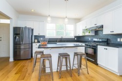 Only 12 homes on this secluded greenbelt street! Forest view from front veranda and primary bedroom. Ample parking and sun, walking distance to schools, rec centre, and shops. So many upgrades in this spacious open plan – new wide plank wood floors, all new paint in and out, new roof and furnace, fabulous ‘5-star hotel’ bathroom reno, gas stove and fireplace, new dishwasher, custom window shutters throughout. Three spacious bedrooms up, 4 bathrooms, plus finished basement with separate entrance, kitchen roughed in for easy suite. Back alley access for additional parking, outbuildings, or a garage. Super clean, nothing to do but move in!