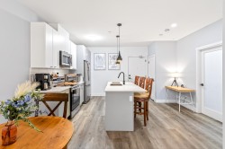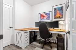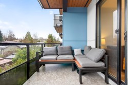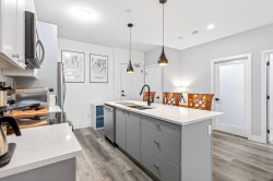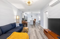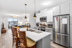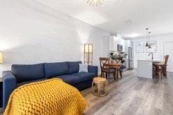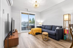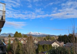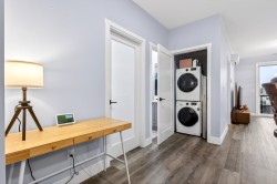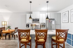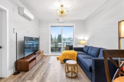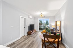 Welcome to this modern 1-bedroom + oversized den, 2-bath home in an ideal Maple Ridge location, minutes from shops, restaurants, transit and everyday essentials. A 5-year-young, fully rainscreened building, this home offers peace of mind and contemporary comfort. Vinyl flooring flows throughout, while the open kitchen features stainless steel appliances, white quartz countertops, and stylish two-tone white and grey cabinetry. Enjoy year-round comfort with an individually controlled heat pump and air conditioning. The primary bedroom is complemented by a spa-inspired ensuite with an oversized walk-in shower, while the second full bathroom includes a tub. The large den easily functions as a second bedroom or home office. Step outside to a view of Golden Ears.